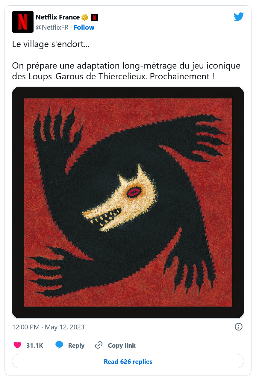 C'est LA surprise de la journée pour tous les cinéphiles en herbe et abonnés à Netflix : sur Twitter, la plateforme a annoncé il y a quelques heures l'adaptation en long-métrage des Loups-Garous de Thiercelieux, célèbre jeu de société d'origine américaine né à la toute fin du XXe siècle. Jeu très populaire des fin de soirées entre amis et des après-midi en famille, il oppose des joueurs incarnant des loups-garous, à d'autres incarnant des villageois. Les premiers doivent manger les seconds, tandis que les derniers doivent tenter de survivre. On se demande donc ce que peut bien donner l'adaptation d'un jeu pareil. Netflix choisira-t-il le film familial, ou bien se concentrera-t-il sur l'aspect horrifique du pitch initial ?