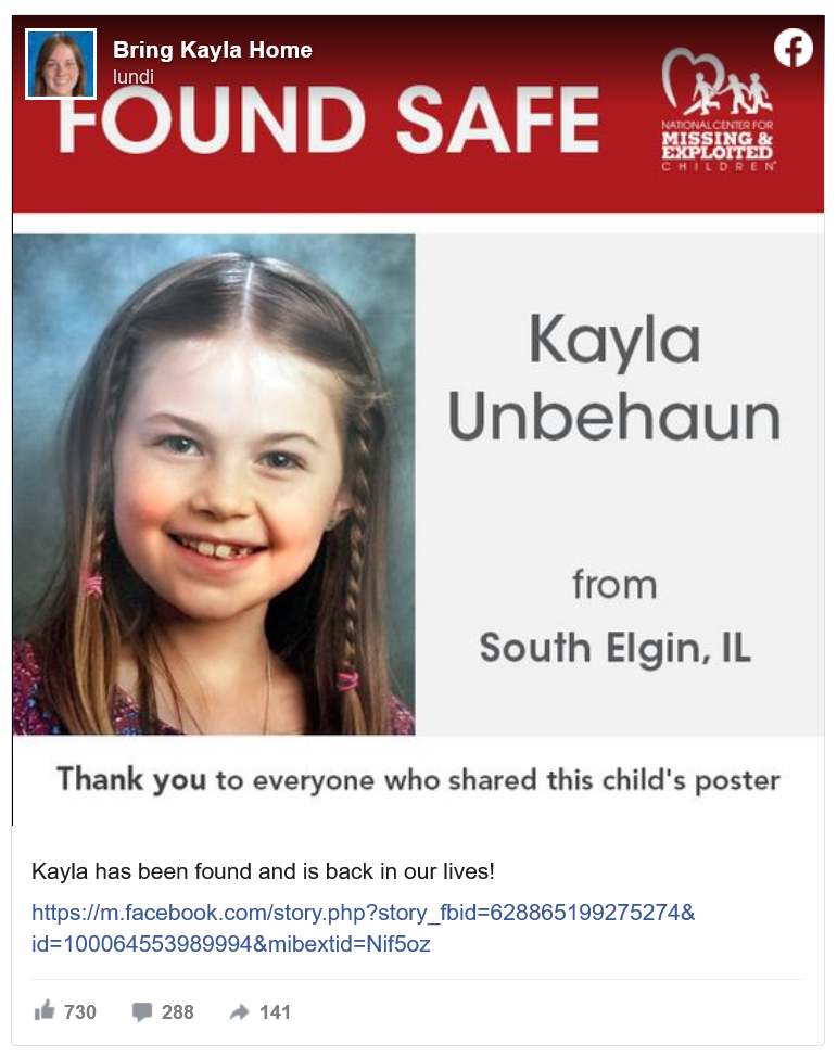 Netflix et l'avis de recherche ont contribué à retrouver Kayla.