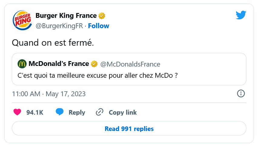 Alors que McDonald's questionne ses followers en leur demandant "leur meilleure excuse pour aller chez McDo", Burger King joue le jeu avec une réponse parfaite : "quand on est fermé". Une pique à laquelle McDonald's sera resté coi. Bien que le géant américain met tout le monde d'accord avec son Big Mac et sa sauce légendaire, Burger King gagne des points auprès des jeunes générations avec une communication parfaite. Un cas d'école qui aura récolté plus de 46 000 likes en seulement quelques heures.