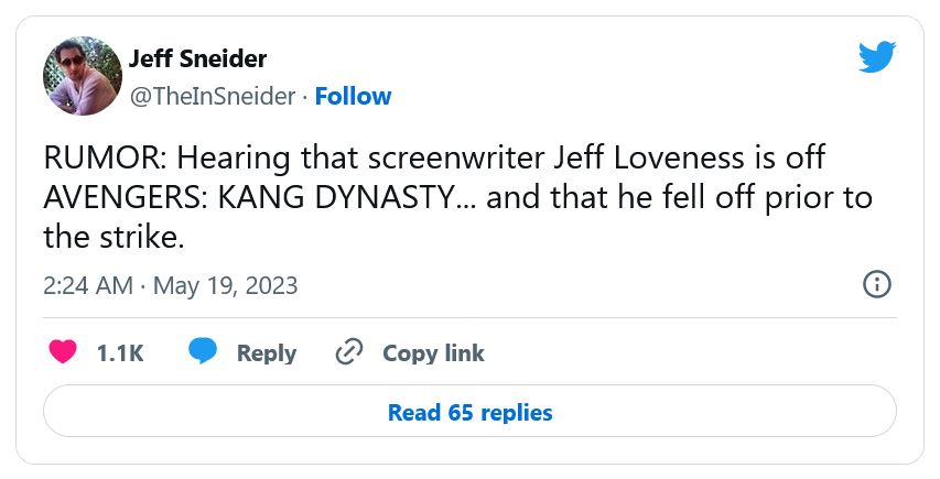 Un départ qui aurait été acté avant la grève massive des scénariste de Hollywood. Co-scénariste d'Ant-Man et la Guêpe : Quantumania, Loveness avait pourtant été la cible d'éloges par David Dastmalchian, Veb dans Quantumania. Il n'avait pas caché son enthousiasme à l'idée que Loveness soit le scénariste d'Avengers : The Kang Dynasty.