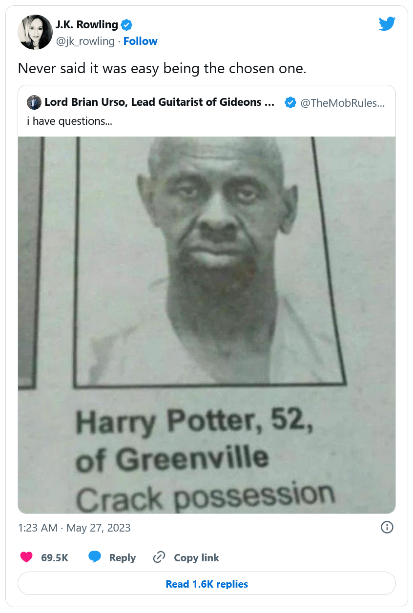 Vous l'aurez compris - on l'espère, c'est simplement un homonyme du sorcier le plus célèbre de la pop culture qui s'est fait arrêter pour possession de drogue. Il est toutefois amusant de constater que JK Rowling a pris le temps de réagir avec humour à un tel fait divers et de le partager avec les fans d'Harry Potter, qui s'amusent à imaginer des aventures alternatives du héros à la cicatrice, en témoigne cet internaute qui estime qu'il s'agit de "l'adaptation Netflix" de ses aventures.