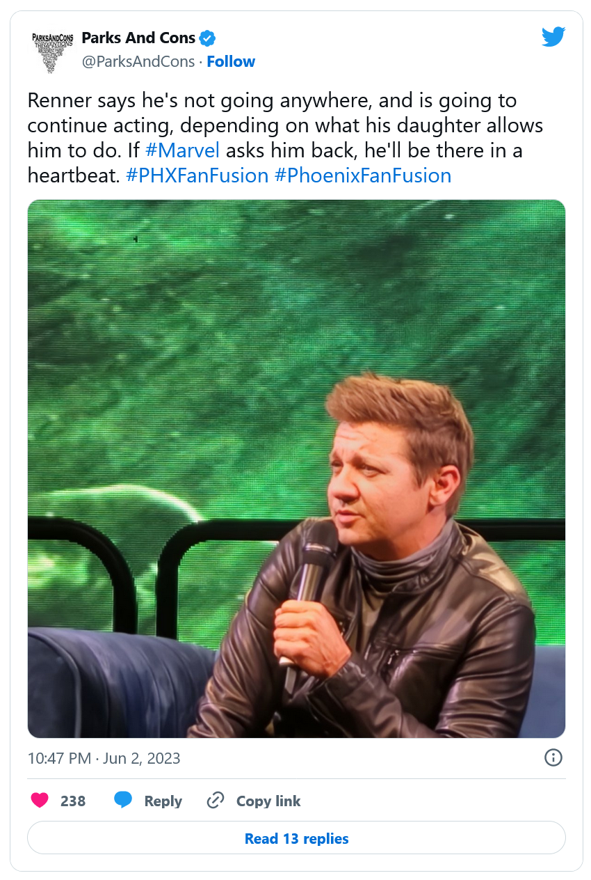 Jeremy Renner dit qu'il ne va nulle part et qu'il va continuer à jouer, en fonction de ce que sa fille lui permet de faire. Si Marvel lui demande de revenir, il sera là en un clin d'œil.