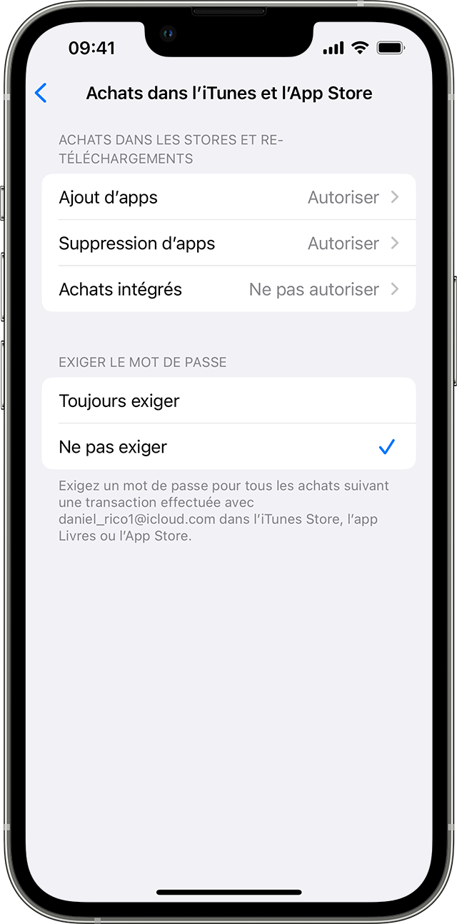 Vous pouvez également modifier les réglages de mot de passe pour des achats supplémentaires dans l'iTunes Store et l'App Store ou dans la librairie. Suivez les étapes 1 à 3, puis choisissez Toujours exiger ou Ne pas exiger.