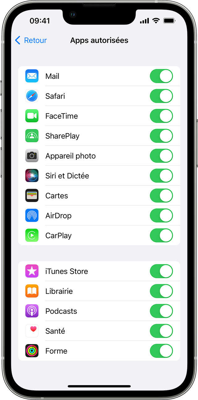 Vous pouvez restreindre l'utilisation d'apps ou de fonctionnalités intégrées. Si vous désactivez une app ou une fonctionnalité, celle-ci ne sera pas supprimée, mais simplement masquée temporairement sur votre écran d'accueil. Par exemple, si vous désactivez Mail, l'app Mail ne s'affichera pas sur votre écran d'accueil tant que vous ne l'aurez pas réactivée.