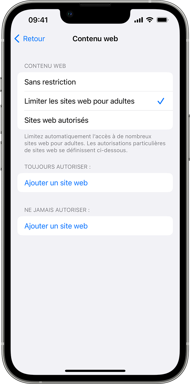 iOS et iPadOS peuvent filtrer automatiquement le contenu des sites web afin de limiter l'accès aux contenus pour adultes dans Safari et les apps de votre appareil. Vous pouvez aussi ajouter des sites web spécifiques à une liste d'autorisation ou de blocage, ou limiter la navigation uniquement aux sites autorisés. Procédez comme suit :