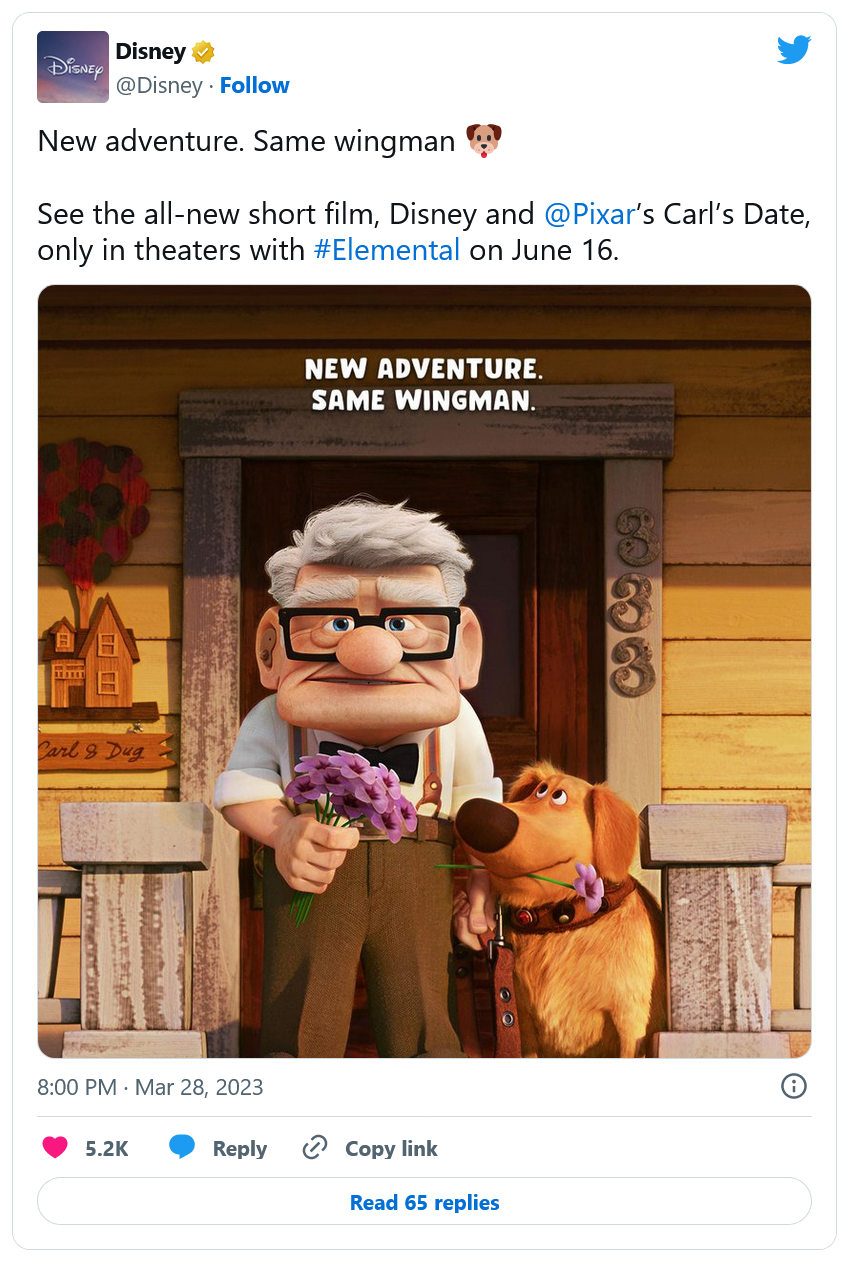 Découvrez le tout nouveau court-métrage de Disney et Pixar, Le Rendez-vous galant de Carl, seulement au cinéma avec Elémentaire, le 16 juin.