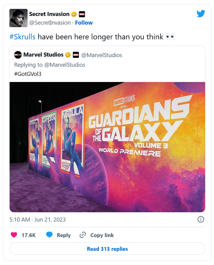 Le compte de la série partage donc un cliché, datant visiblement d'une avant-première du film Les Gardiens de la Galaxie 3, sorti il y a quelques semaines. Mais alors, que comprendre de ce message pas si subliminal ? La publication a été vue près de deux millions de fois, et les fans n'ont pas hésité à faire état de leur trouble dans les commentaires. De nombreux utilisateurs ont commencé à paniquer, pensant que la phrase faisait référence à l'un des personnages présents sur l'immense affiche. Gamora, que l'on aperçoit au centre, a été désignée par beaucoup, tandis que certains s'insurgeaient du parallèle, arguant que son épiderme vert ne signifiait pas forcément une telle chose. Tandis que le débat faisait rage, plusieurs membres altruistes ont attiré l'attention de tous sur le côté gauche de l'image...