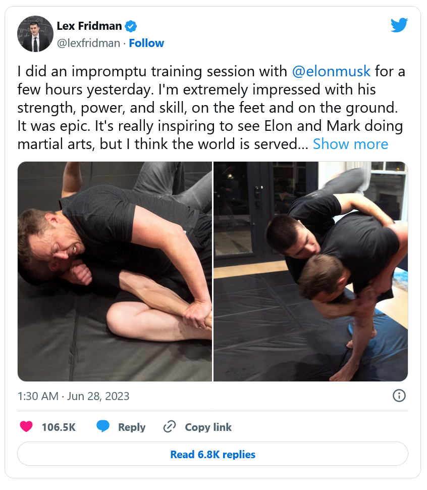 Alors que le combat - qu'il soit en cage ou non - entre Elon Musk et Mark Zuckerberg n'a pas encore été confirmé, le boss de Twitter a déjà commencé à s'entraîner sur le terrain. Un chercheur au MIT adepte d'arts martiaux, Lex Fridman, a en effet publié un tweet ce mardi 27 juin, dans lequel il a partagé deux photos de son entraînement avec le milliardaire. Et si Fridman souhaite que le duel des milliardaires n'ait pas lieu, il se dit impressionné par les talents de Musk !