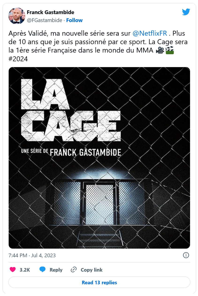 C'est sur son compte Twitter ainsi que sur son compte Instagram que Franck Gastambide a officiellement annoncé sa nouvelle série ce mardi 4 juillet. Intitulée La Cage, elle prendra place, comme son nom le laisse penser, dans le monde du MMA, c'est-à-dire des Arts Martiaux Mixtes, dont la popularité a explosé ces dernières années. Passionné par ce sport, l'acteur, réalisateur et scénariste est fier de rappeler qu'il s'agira de la toute première série française qui lui sera consacrée ! A cette occasion, le Français rompt avec Amazon pour collaborer avec le géant du streaming, Netflix.