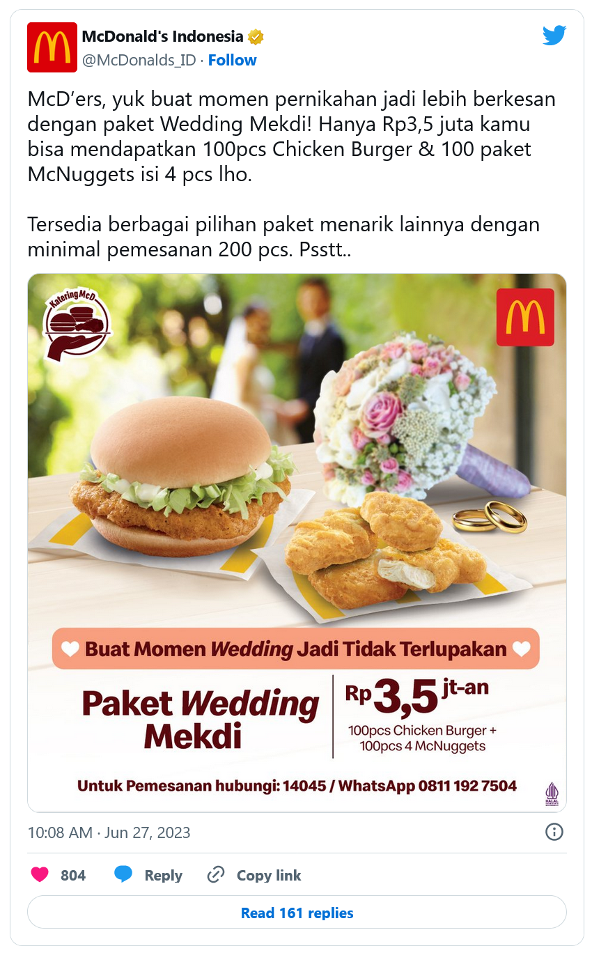 McDonald's, rend votre mariage encore plus mémorable avec le forfait Wedding Mekdi ! Pour seulement [213 euros environ], vous pouvez obtenir 100 pièces de Chicken Burger et 100 paquets de 4 McNuggets.