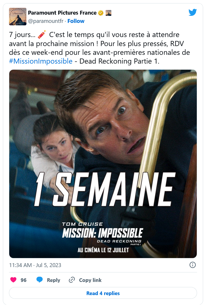 Mais finalement, Tom Cruise n'a pas besoin d'exploser le box-office pour détenir un record unique en son genre. Sur sa soixantaine de films, 30 d'entre eux ont dépassé la barre des 100 millions de dollars de recettes. Un score impressionnant propre à Tom Cruise. Parmi ceux-ci ont peut évidemment citer la licence Mission Impossible, mais aussi des films comme Jerry Maguire, Rain Man, La Guerre des Mondes ou encore Cocktail. Le pouvoir de vedette de Cruise, combiné à sa longévité et à son éthique de travail, rend extrêmement improbable qu'un autre acteur se rapproche d'un tel record. Retrouvez Tom Cruise à l'affiche de Mission Impossible : Dead Reckoning - Partie 1 le 12 juillet prochain au cinéma :