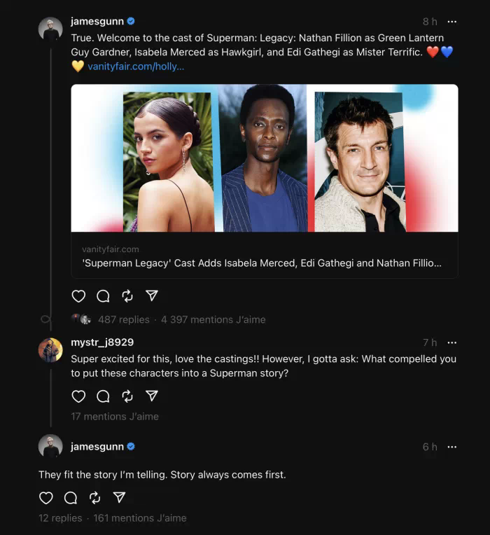 Superman sera ainsi accompagné du Green Lantern de Guy Gardner, Hawkgirl et Mister Terrific. Trois nouveaux super-héros qui seront incarnés respectivement par Nathan Fillion, Isabela Merced et Edi Gathegi. Une information confirmée par James Gunn en personne sur Threads, le Twitter de Meta.