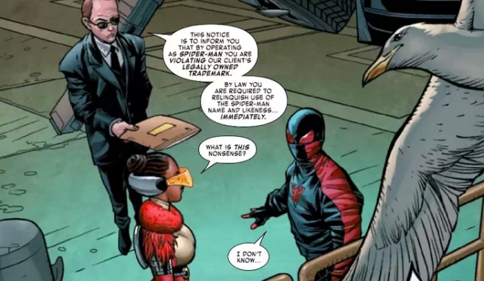 Dans Miles Morales : Spider-Man #32 (par Saladin Ahmed, Christopher Allen, Guru-eFX, et Cory Petit) une organisation appelée Beyond Corporation veut empêcher le super-héros de porter le nom de l'homme-araignée. Alors que lui sa petite amie Tiana Toomes, alias Starling, ont fini de combattre le Maître de corvée, de mystérieux hommes en costume les accostent. Ces représentant de la Beyond Corporation, une multinationale qui rachète des "marques de super-héros" comme par exemple, le nom de Spider-Man, dont ils détiennent les droits sur le nom et l'image, lui ordonnent de cesser de porter ce nom. Une situation fictive qui n'est pas sans refléter la réalité !