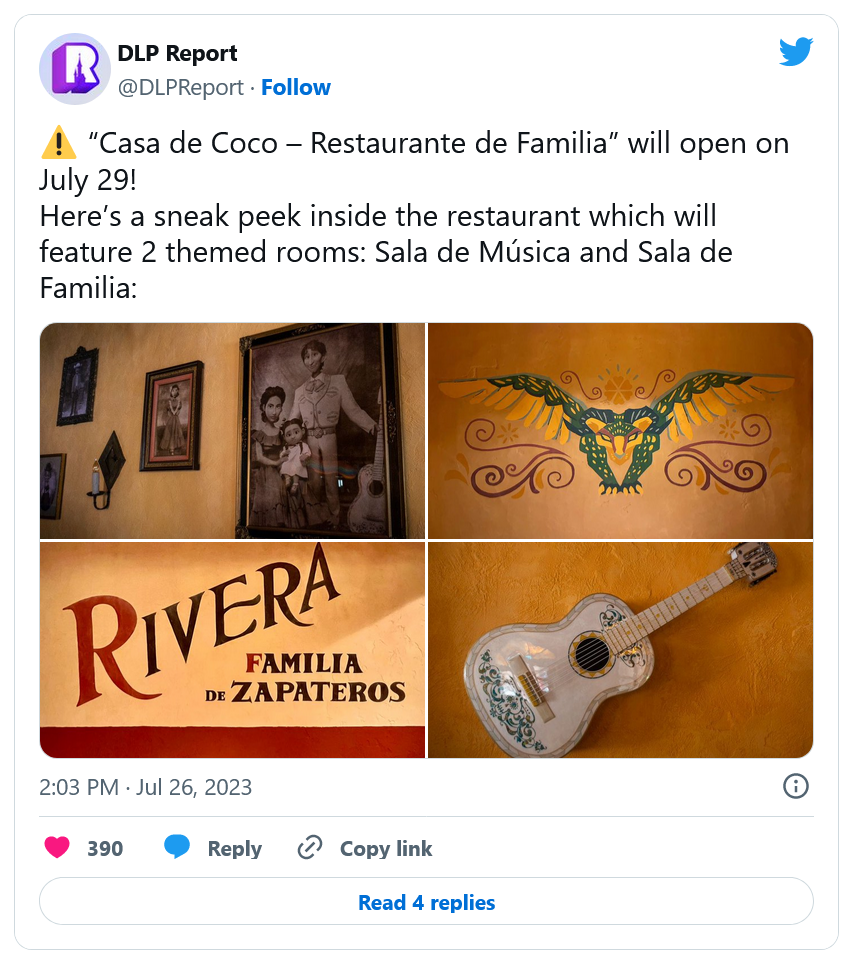 A l'entrée du Casa de Coco - Restaurante de Familia, vous serez accueilli par une impressionnante statue en l'honneur de Miguel, le personnage principal de Coco, avec sa guitare à la main. Une fois dans le restaurant en lui-même, au plafond, vous verrez des "Papel Picados" colorés. Il s'agit d'ornements en papier faisant office de guirlandes inspirés du folklore mexicain. Des portraits de la famille de Miguel seront également accrochés un peu partout dans la Salle de Familia, tandis que la Salla de Musica aura aussi le droit à son lot de surprises... que l'on vous laissera le plaisir de découvrir en temps voulu ! Rappelons que ce nouveau restaurant ouvrira ses portes dès le 29 juillet à Disneyland Paris !