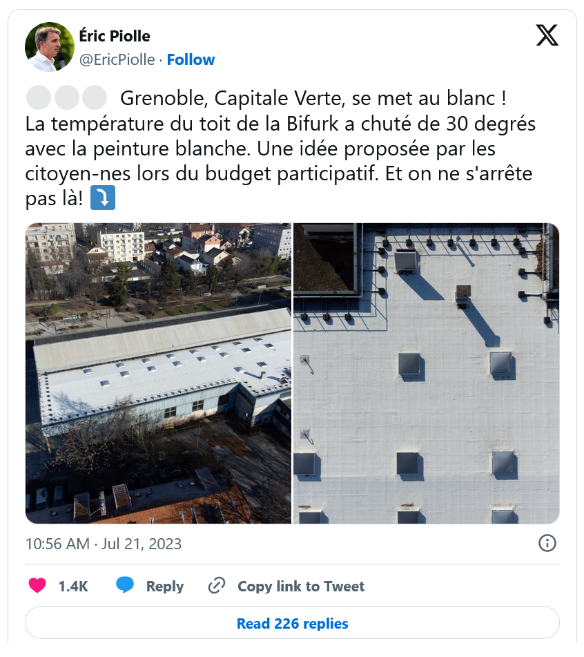 Une opération réussie, selon le maire de Grenoble Eric Piolle. " La température du toit de la Bifurk a chuté de 30°C avec la peinture blanche", se réjouissait-il sur Twitter le 21 juillet. Une étude est " en cours sur d'autres bâtiments municipaux" et des rues ont également été rénovées sur le même principe en utilisant des "matériaux clairs", précise l'édile dans un autre message.