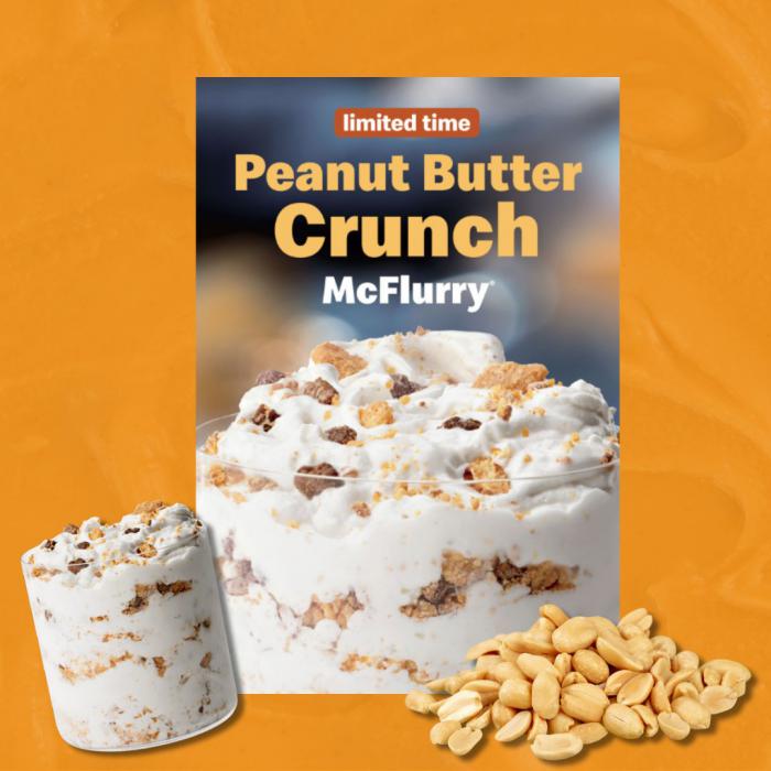 Depuis ce mercredi 9 août, aux États-Unis, les restaurants McDonald's servent leurs fameuses crèmes glacées en mode beurre de cacahuète, qu'ils ont appelées Peanut Butter Crunch McFlurry. La chaîne de restauration rapide innove quelque peu en matière de garnitures, puisque des morceaux de biscuits au chocolat et au beurre de cacahuètes ainsi que des bouchées de céréales croustillantes, semblables à des Rice Krispies, sont mélangés à la crème glacée habituelle de la chaîne. Sur le site officiel des fast food, on peut lire :