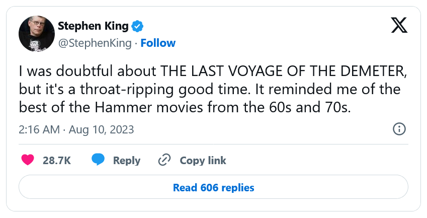 L'écrivain du Maine vient de partager son avis sur Le Dernier Voyage du Demeter en expliquant que même s'il avait des doutes avant de le visionner, il a apprécié ce "bon moment à couper le souffle".