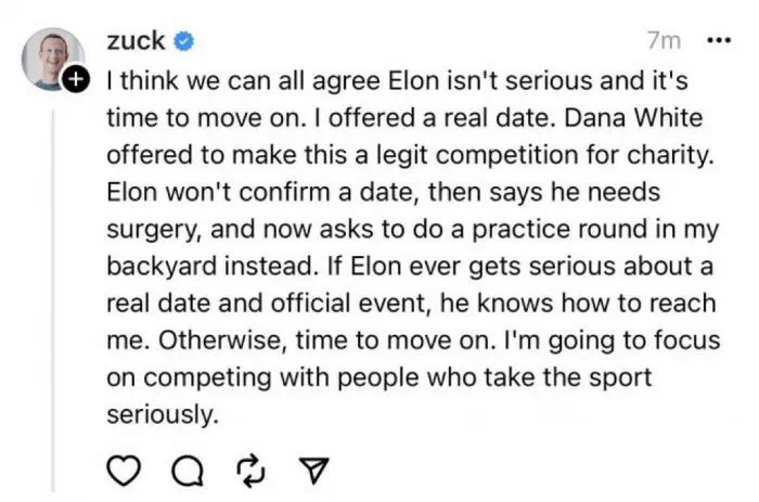 Cependant, si les entraînements dans les deux camps sont en cours et que le lieu semble se préciser, le combat pourrait bien être avorté. Et pour cause : Mark Zuckerberg vient d'annoncer sur Threads, son réseau concurrent à X, qu'il jetait l'éponge. La raison serait le manque d'implication de l'instigateur de cette rencontre et son manque de sérieux. Une attitude qui énerve le patron de Meta.