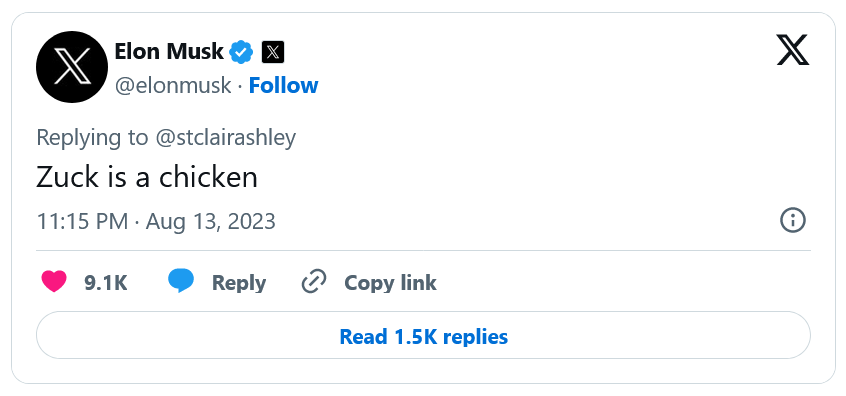 Il ne reste plus qu'à patienter pour voir si une date sera finalement proposée par le fondateur de SpaceX afin d'avoir une chance de voir les deux hommes s'affronter sur le ring. Pour l'heure, sa seule réaction a été d'insulter Mark Zuckerberg de "poulet" sur son réseau social X.