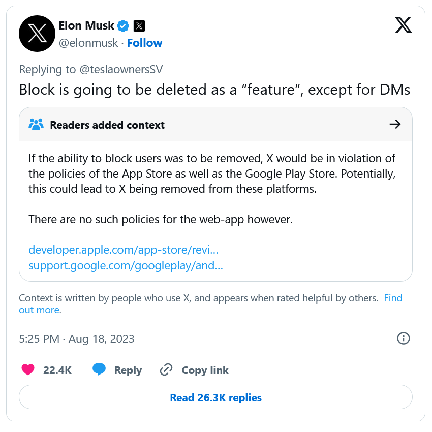 En effet, Musk vient d'annoncer qu'il sera désormais impossible de bloquer d'autres utilisateurs, hormis pour les DM (messages personnels) ; la seule façon de lutter contre les personnes que vous ne souhaitez pas voir sur X sera de masquer leurs comptes. Le nouveau patron de Twitter explique en commentaire que le bloquage "n'a aucun sens". Une décision qui pourrait être perçue comme un profond recul concernant la lutte contre le cyber-harcèlement. On rappelle que le cyber-harcèlement est un fléau qui touche de très nombreuses personnes, et peut avoir une issue tragique.