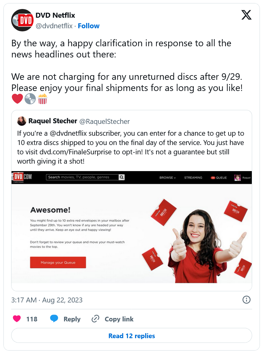 Si cela peut sembler être une belle preuve d'altruisme de la part de l'entreprise, c'est aussi et surtout un bon moyen de liquider leur stock restant à l'approche de la fin du service. Toutefois comme le rapporte CNBC, les clients auront tout de même la possibilité de renvoyer les DVD, et ce jusqu'au 27 octobre 2023.