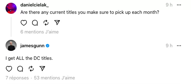 James Gunn n'a jamais caché son engouement pour les bandes dessinées de super-héros, qu'il s'agisse de DC Comics ou de Marvel. Ce grand lecteur de comics books partage souvent avec ses abonnés ses titres préférés ou ceux qu'il est actuellement en train de lire. Très prolixe sur les réseaux sociaux, ses déclarations ne passent pas inaperçues ! Et lorsqu'il s'agit d'histoires publiées par la "Distinguée Concurrence", le réalisateur ne fait l'impasse sur aucune d'entre elles. Samedi, il a révélé à un internaute qui lui demandait quels titres actuels il lit tous les mois qu'il n'en sélectionne pas qu'un ou plusieurs, mais qu'il les lit tous !