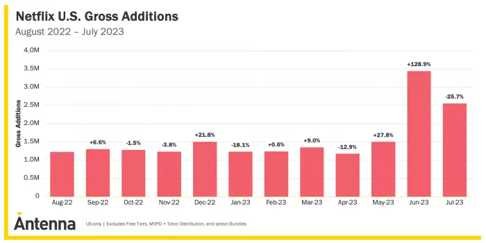 En cette fin août, l'entreprise Antenna, qui travaille notamment avec les entreprises pour les aider à mieux comprendre les besoins de leurs clients, a partagé les données qu'elle a recueillies entre août 2022 et juillet 2023 concernant les abonnements à Netflix aux Etats-Unis. Et le constat est sans appel : depuis juin, le nombre d'abonnés a explosé ! Après avoir diminués en avril, les chiffres indiquent ainsi une augmentation du nombre de nouveaux abonnés de 27,8 % par rapport au mois précédent, mais surtout un bond de 128,9 % en juin : un record. Le nombre de nouveaux abonnés a ensuite diminué en juillet, mais s'est tout de même élevé à 2,6 millions.