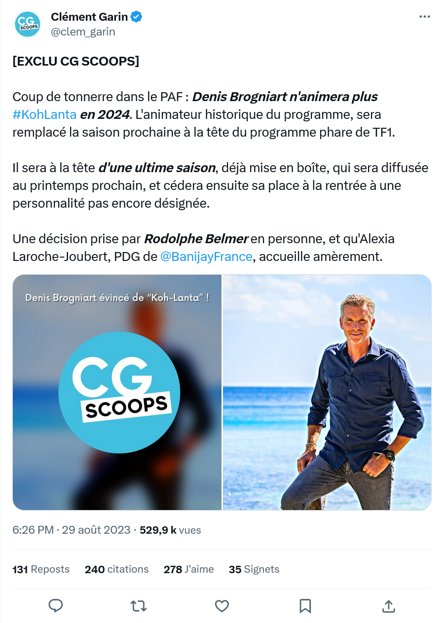 C'est hier au soir, aux alentours de 18h30, qu'a débuté cette sombre affaire. Là, un utilisateur, Clément Garin, en charge de la page CGScoops, fait une annonce pour le moins surprenante : il publie en effet un post annonçant le départ de Denis Brogniart, animateur emblématique de l'émission diffusée sur TF1. L'internaute précise que la prochaine saison du programme, déjà tournée, sera bien présentée par l'habitué, qui cédera donc sa place dès 2024. Selon lui, cette décision radicale a été prise par Rodolphe Belmer, le Directeur général de la chaîne. Alexia Laroche-Joubert, productrice de l'émission, aurait de son côté reçu la nouvelle avec une certaine amertume. Ci-dessous, on vous laisse découvrir le post, qui continue de faire débat :