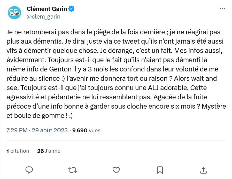 Celui qui a dévoilé le "scoop" n'en démord pas. Ainsi, dans les commentaires relatifs à sa publication initiale, il ajoute que la chaîne et la production ne veulent surtout pas que l'information s'ébruite "avant la diffusion de la saison prochaine". Il cite d'ailleurs Guillaume Genton, notamment chroniqueur à TPMP, qui officiait à la matinale d'Europe 2. Selon Garin, ce dernier a d'ores et déjà fait état du "bras de fer" entre le dirigeant de la chaîne et la productrice. Félicité par ses lecteurs, il affirme être sûr de lui "à 3000%", évoquant des "recoupements" et la confirmation d'un "membre du directoire de Banijay".