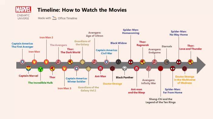 Si le MCU a débuté en 2008 avec Iron Man, les dates de sortie des différents films et séries ne concordent pas forcément avec leur emplacement dans la timeline du MCU. En effet, le premier film de la timeline du MCU est en réalité Captain America : First Avenger (2011), qui se déroule pendant la Seconde Guerre mondiale. Puis, vient ensuite Captain Marvel (2019), qui se déroule dans les années 1990. Bref, vous avez compris l'idée. Ce n'est pas parce qu'un film Marvel sort en 2023 que son intrigue se déroule en 2023.