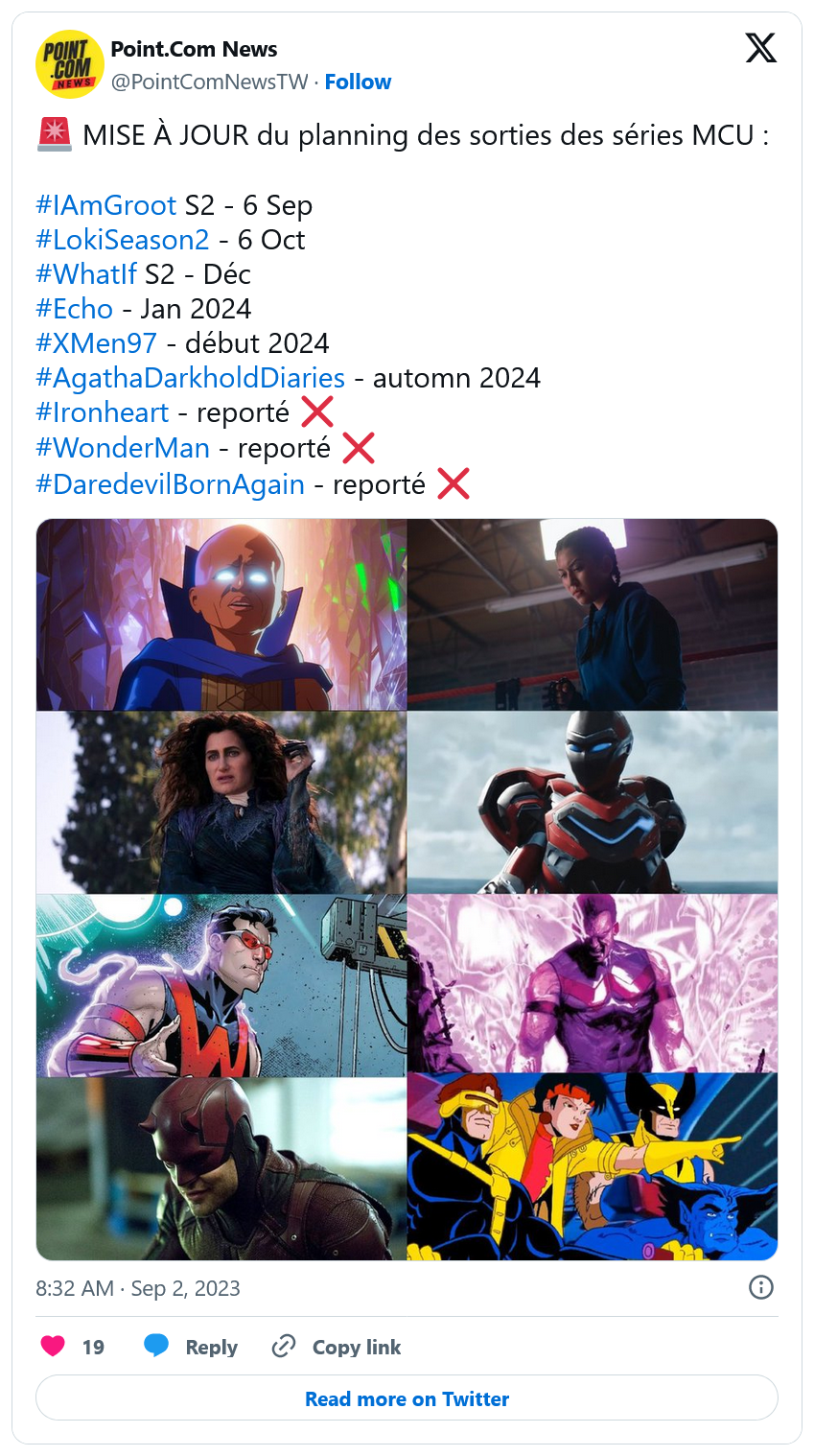 Naturellement, cette double grève impacte directement les spectateurs. C'est tout l'univers du divertissement américain qui se retrouve actuellement paralysé. Beaucoup de films et de séries sont ainsi annoncés "en pause indéterminée" jusqu'à ce qu'un accord soit trouvé. Cela impacte évidemment Disney, Marvel et ses séries Disney+. La société vient d'annoncer de gros changements dans le calendrier, car tout le planning est désormais retardé. Par ordre chronologique, Disney explique que la saison 2 de What if... ? débutera en décembre pendant les fêtes de Noël. Elle devait arriver début 2023 mais Disney n'a pas souhaité préciser la raison de ce retard. Le spin-off de Hawkeye, la série Echo avec Alaqua Cox est déplacée du 29 novembre à janvier 2024. Tous les épisodes devraient sortir en même temps, cela ne change pas. X-Men '97, le revival de la série X-Men des années 1990 passe d'une sortie automne 2023 à début 2024, sans précision. La saison 2 de Loki est quant à elle toujours maintenue au 6 octobre, afin d'explorer (on l'espère) le multivers. Enfin, n'attendez pas Ironheart, Daredevil : Born Again et Wonder Man. Ces séries sont tout simplement retirées du calendrier.