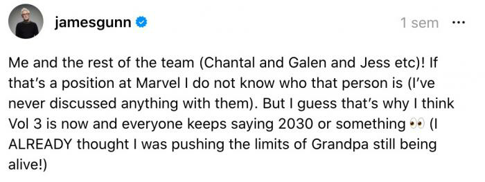 Si c'est un poste chez Marvel, je ne sais pas qui est cette personne (je n'ai jamais discuté de quoi que ce soit avec elle). Mais je suppose que c'est pour ça que je pense que les Gardiens de la Galaxie Vol. 3 se déroule dans le présent et que tout le monde n'arrête pas de dire 2030 ou quelque chose comme ça.