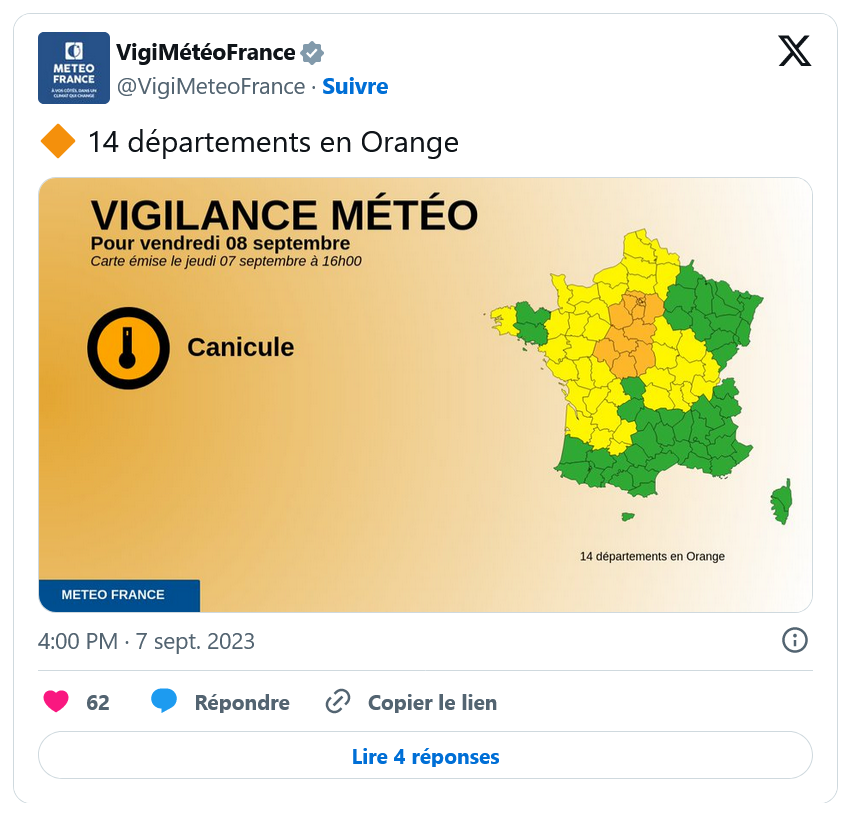 Au total, 14 départements sont donc concernés par cette vigilance orange : Paris, Seine-et-Marne, Yvelines, Essonne, Hauts-de-Seine, Seine-Saint-Denis, Val-de-Marne, Val-d'Oise, Indre-et-Loire, Cher, Eure-et-Loir, Indre, Loiret et Loir-et-Cher. Selon Météo France, il s'agit de la "première vigilance orange pour le phénomène canicule, au-delà de la saison estivale, depuis sa mise en place en 2004".