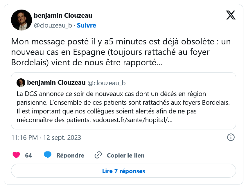 Selon ce bulletin, sept des personnes hospitalisées sont en réanimation ou en unité de surveillance continue. Un médecin réanimateur du CHU de Bordeaux affirme sur X, l'ancien Twitter, que cette victime est décédée en région parisienne. Il évoque également un nouveau cas signalé en Espagne, toujours rattaché au "foyer bordelais". Et d'autres cas peuvent toujours apparaître, alerte la Direction générale de la santé.