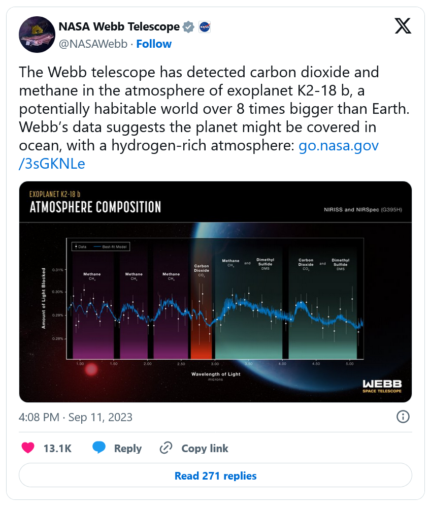 Le téléscope Webb a détecté du dioxyde de carbone et du méthane dans l'atmosphère de l'exoplanète K2-18 b, un monde potentiellement habitable qui est plus de 8 fois plus grand que la Terre. Les données de Webb suggèrent que la planète pourrait être récouverte d'un océan, avec une atmosphère riche en hydrogène.