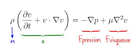 Voici donc l'équation de Navier-Stokes, et en quoi elle est l'analogue de « Somme des forces = m a » pour un fluide :