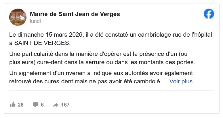 Sur les réseaux sociaux, la mairie appelle ses habitants à la vigilance, un riverain en aurait d'ailleurs retrouvé chez lui sans avoir été cambriolé pour autant.