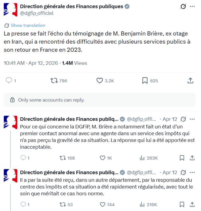 “M. Brière a fait un état d'un premier contact anormal avec une agente dans un service des impôts qui n'a pas perçu la gravité de sa situation. La réponse qui lui a été apportée est inacceptable. Nous regrettons vivement que cet usager n'ait pu initialement bénéficier de toute l'attention qu'il convenait de lui apporter compte tenu du contexte. Ce défaut d'accompagnement est tout à fait contraire à nos valeurs”, a indiqué l'administration.