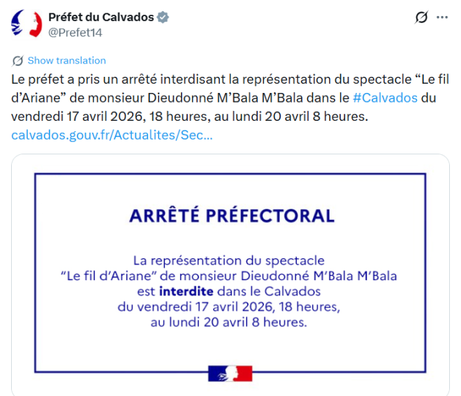 Alors que la préfecture du Calvados a publié un arrêté interdisant les spectacles de Dieudonné dans le département, celui-ci a affirmé qu'il souhaitait organiser un événement dans un rayon de 30 kilomètres autour de Caen.